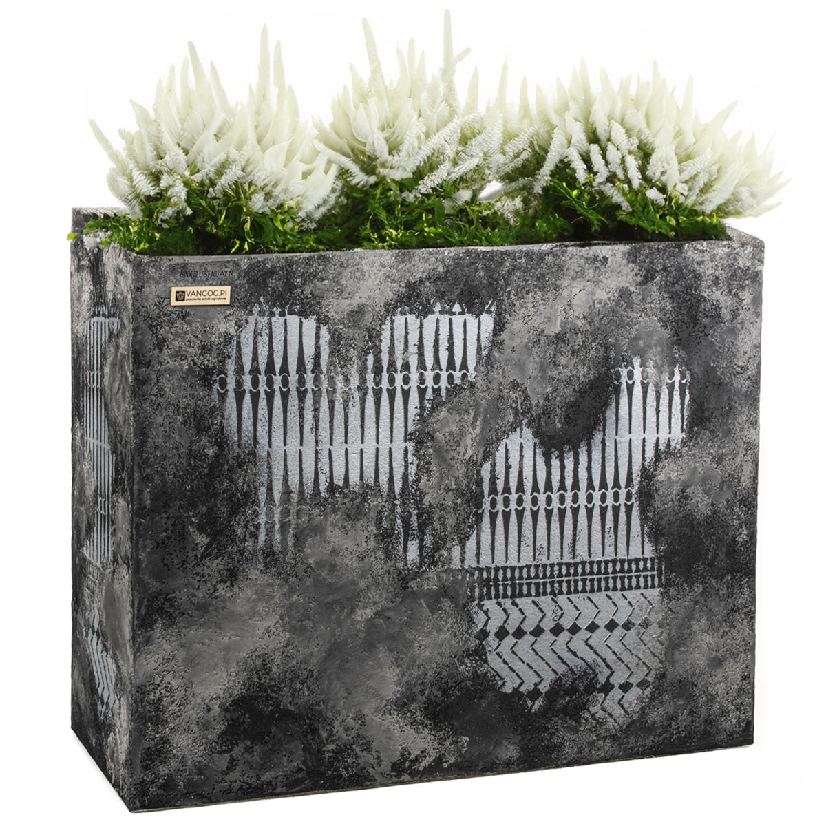 Donica Mediolan to arcydzieło wzornictwa. Jej połączenie głębokiej czerni z subtelnie przełamującymi szarościami oraz unikalnym wzorem tworzy niezwykle modny i oryginalny efekt. Ta donica jest prawdziwym dziełem sztuki, które z pewnością nada każdej przestrzeni niezwykłego i nowoczesnego klimatu. Czarna barwa donicy Mediolan symbolizuje elegancję, luksus i tajemniczość. Szarość, której subtelnie użyto jako akcentujący kolor, nadaje jej delikatności i równowagi. Wzór, który idealnie wpasowuje się w całość, dodaje jej charakteru i sprawia, że jest absolutnie wyjątkowa.