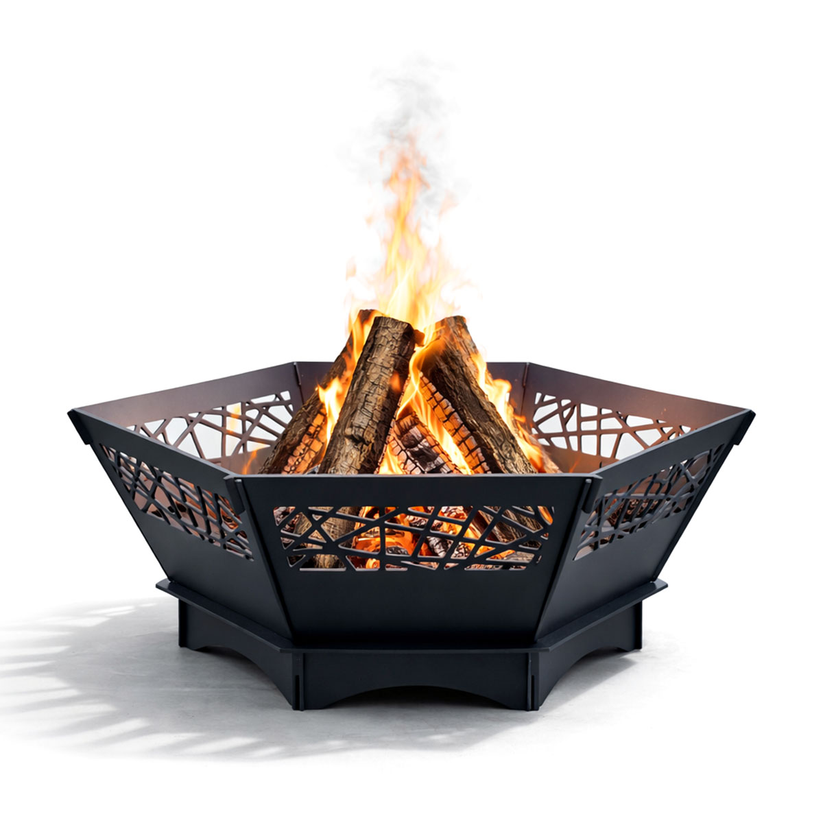 Ażurowe wycięcia w stalowych panelach pozwalają światłu ognia wydobywać się na zewnątrz, tworząc subtelną grę cieni po zmroku. W ciągu dnia Hexagon prezentuje się jako elegancki element architektury ogrodu – wyważony, nowoczesny i ponadczasowy.