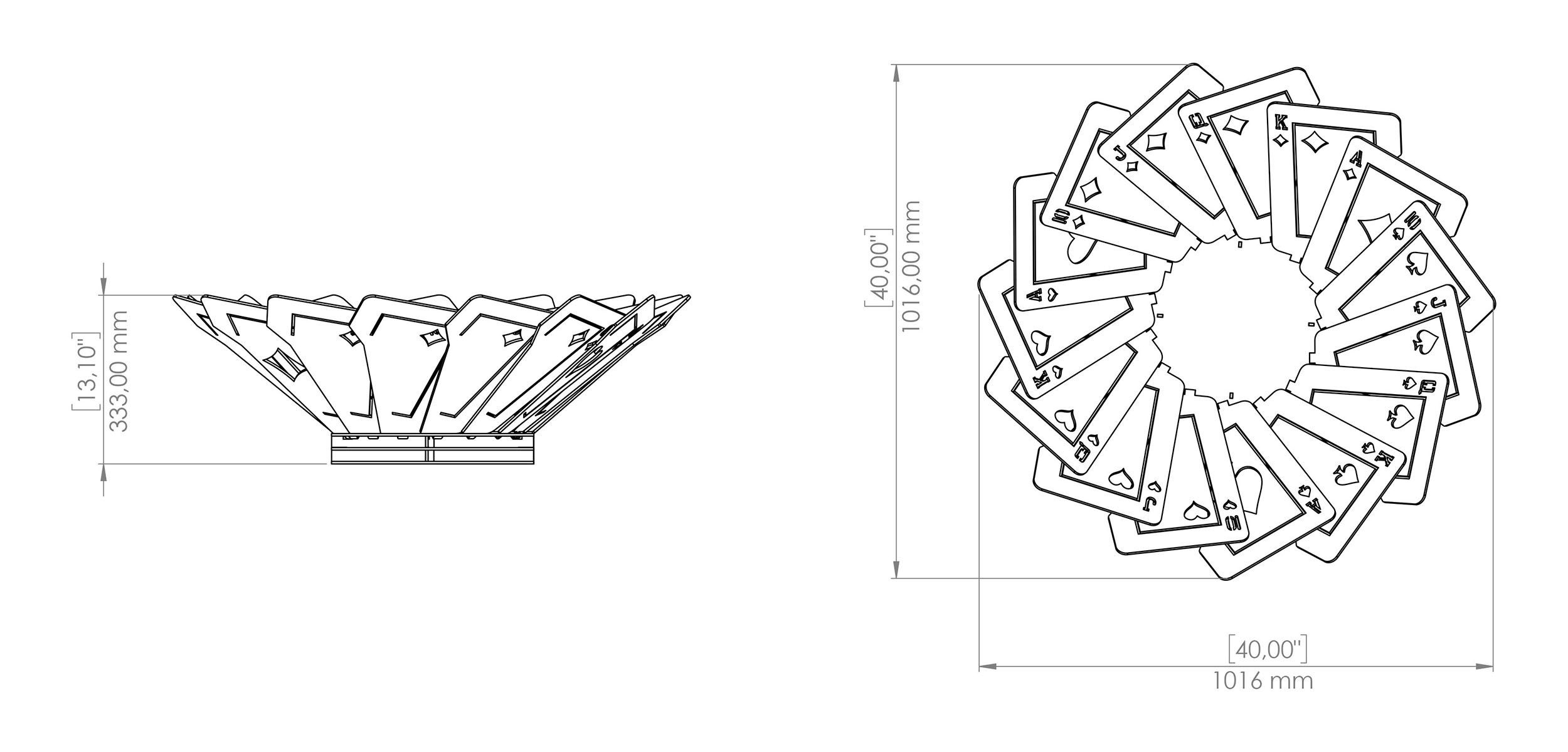 Niska forma o wysokości 35 cm oraz imponująca średnica 100 cm zostały zaprojektowane z myślą o wygodnym użytkowaniu. Taka konstrukcja umożliwia swobodne siedzenie wokół paleniska i komfortowe korzystanie z ognia jako źródła ciepła i nastroju. Ażurowe panele w kształcie kart tworzą hipnotyzującą grę światła i cienia, szczególnie efektowną po zmroku, kiedy płomienie odbijają się od stalowych powierzchni.